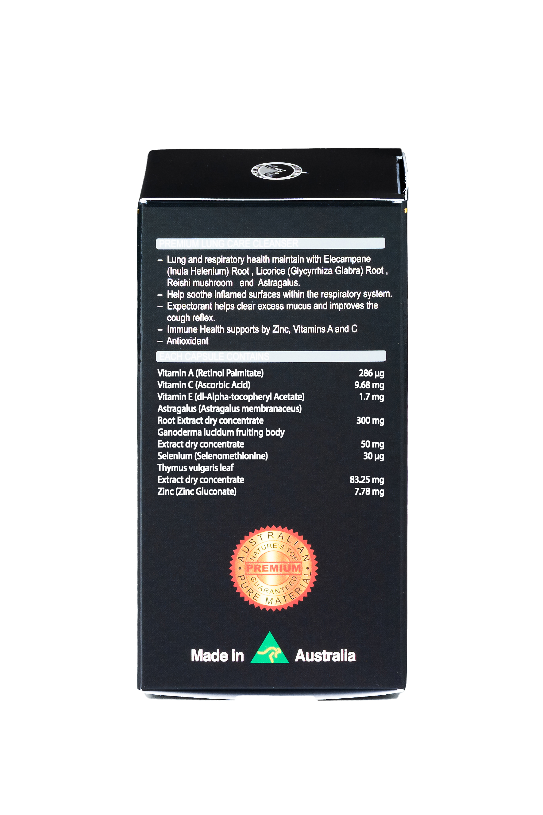 | 원재료명 및 함량 | 비타민 A (레티놀 팔미테이트) 286μg 비타민 C (아스코르브산) 9.68mg 비타민 E (dl-알파-토코페릴 아세테이트) 1.7mg 황기뿌리 건조농축추출물 300mg 영지버섯 자실체 건조농축추출물 50mg 셀레늄 (셀레노메티오닌) 30μg 타임잎 건조농축추출물 83.25mg 아연 (글루콘산 아연) 7.78mg |