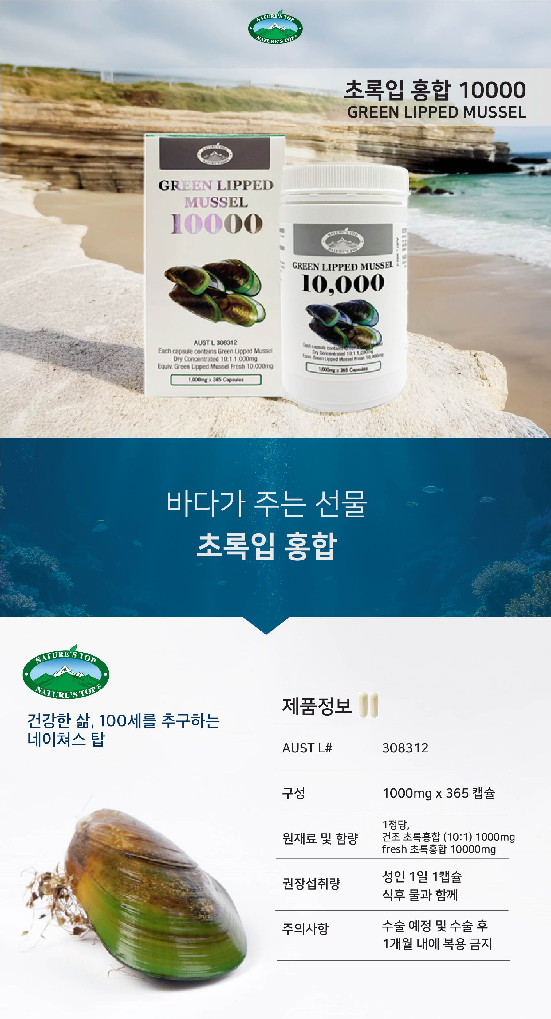호주 네이쳐스탑 초록홍합 10000mg 리프리놀 GREEN LIPPED MUSSEL 365정